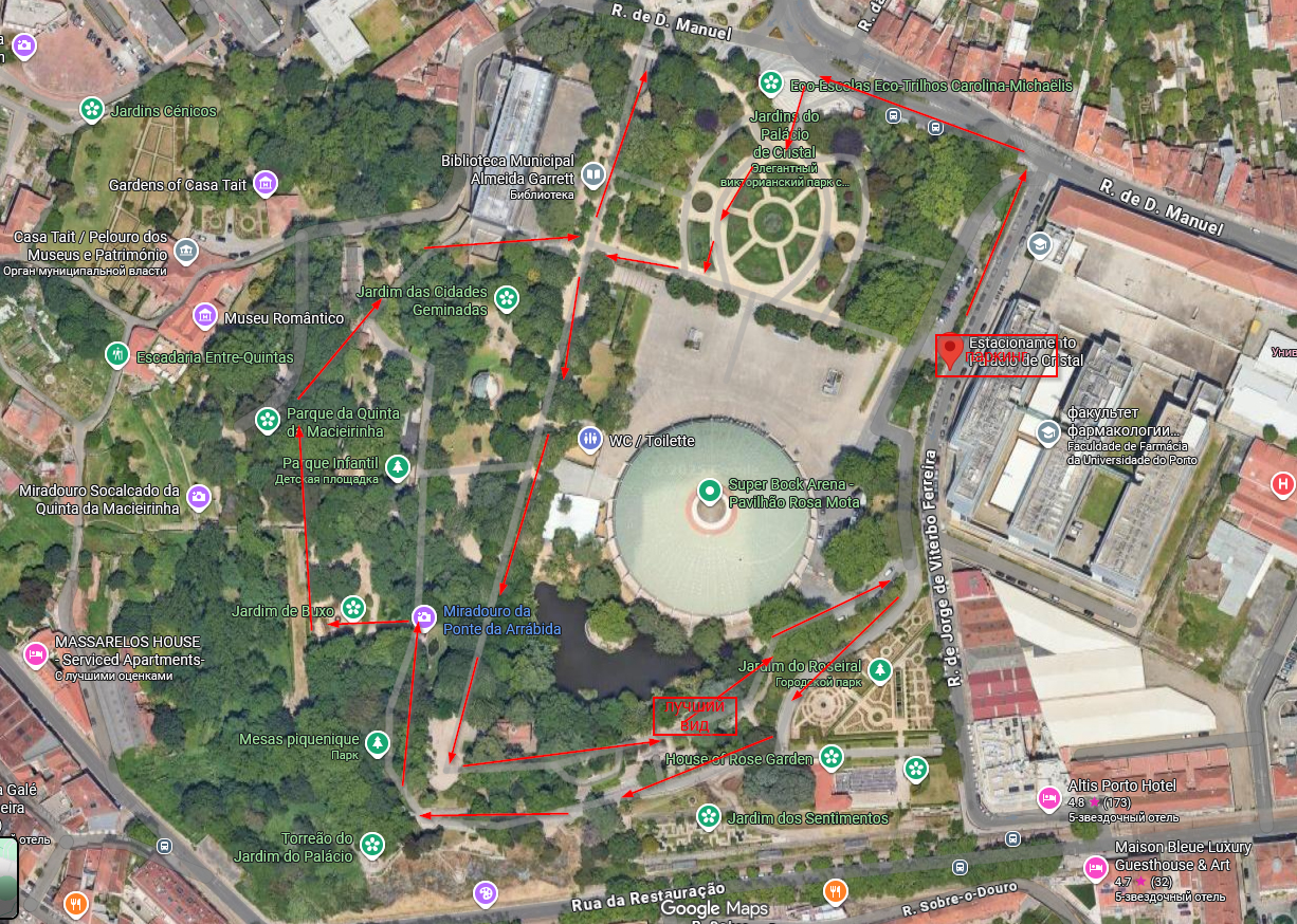 На первый взгляд парк Parque e Jardim da Fundação Serralves (Фонд Серралвеш) не стоит своих денег - 15 евро с человека. Но это только на первые 10 минут парка) Вход в парк - Fundação Serralves, там же рядом бесплатная парковка вдоль дороги (ориентировочные координаты 41.159826, -8.660596). Мест всегда хватает, желающих посещать парк за такие деньги не много. Билеты можно взять на месте в кассе и там же карту парка. Обратите внимание, парк работает до 18, а на его посещение надо около 2-х часов. В парке главное найти каждую достопримечательность, чтобы не пропустить самые ценные) Лучшими локациями являются аллея вниз от музея Casa de Serralves, которая выводит ко второй локации - Treetop Walk Serralves (прогулка "по верхушкам деревьев на подвесной дорожке"), далее поле с крупным рогатым скотом. Ниже приведен маршрут прогулки по парку: красные стрелочку в ту сторону, желтые - возврат ко входу (он же выход). Дважды тут делать нечего, но один раз стоит посетить. В сентябре - октябре в районе аллеи роз можно насобирать целый пакет съедобных каштанов). Кстати, в парке все объекты относятся к современному искусству.