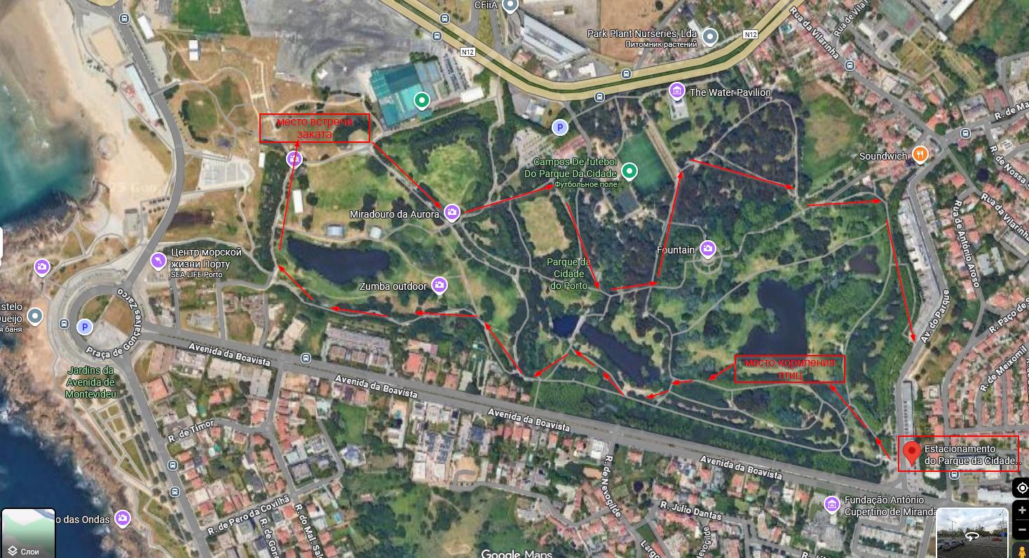 Идеальный парк для прогулок и выгула собак! Тут круговой маршрут не менее 1 часа (ниже маршрут на карте), а если обходить каждое озеро по кругу и проходиться по разным тропинкам, то и того больше. Особо тут нечего смотреть, но атмосфера настоящего релакса гарантирована. Возле парка удобный бесплатный паркинг Estacionamento do Parque da Cidade (Boavista). Возле первого озера множество птиц, которых при желании можно покормить. Удобно парк посетить за минут 30 до заката, тогда в конце парка открывается шикарный вид на закат в воду (фото выше в разделе "Места встречи заката в Порту"). Назад возвращаться целиком комфортно, даже по темноте.