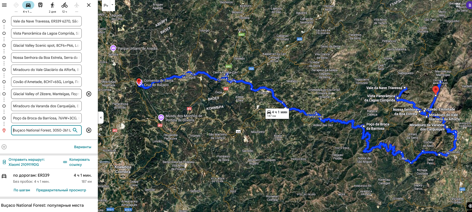 Vale da Nave Travessa + Vista Panorâmica da Lagoa Comprida + Miradouro, Vale de Loriga + Nossa Senhora da Boa Estrela + Glacial Valley Scenic spot + Miradouro do Vale Glaciário da Alforfa+ Covão d'Ametade + Glacial Valley of Zêzere + Covão dos Conchos (под вопросом) + Miradouro da Varanda dos Carqueijais + Poço da Broca da Barriosa + Buçaco National Forest +Cruz Alta - Viewpoint