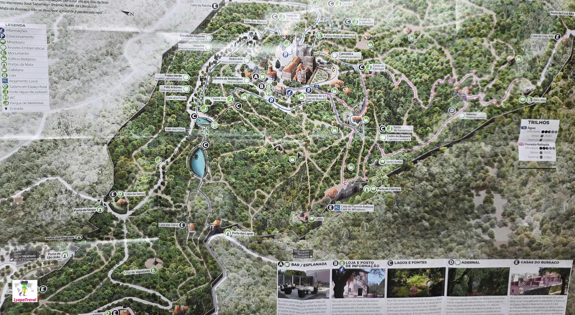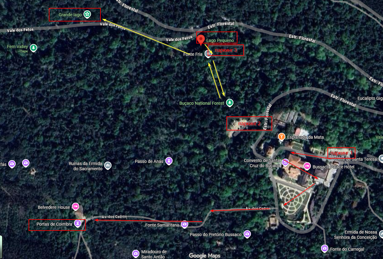 - Buçaco National Forest ⭐⭐⭐⭐⭐ - Отличная прогулка по "цивилизованному" лесу. Тут есть и дворец красивый, цветочный сад за дворцом и лесная территория в округе. Тут ездит электрокар - за 15 евро с человека вы можете покататься по одним и тем же дорогам целый час... Не стоит этого делать. Тут реально все посмотреть самостоятельно, заехав во внутрь на своей машине. За въезд взымается плата около 8 евро за машину. Возле дворца отеля есть достаточно большая парковка. Стоя на "Паркинг 1 или 2" можно посмотреть дворец снаружи (внутри делать нечего), сад за дворцом и прогуляться по дорожке до смотровой площадки Portas de Coimbra. Затем можно переехать на машине до "Паркинг 3" и от туда пройти к малому озеру, подняться по красивейшим ступеням вверх, спуститься назад к малому озеру и от него пройти до большого озера, которое можно обойти по кругу. Все это займет у вас 1-2 часа не спешным шагом. В этом лесу много эвкалиптовых деревьев, поэтому запах стоит шикарный!