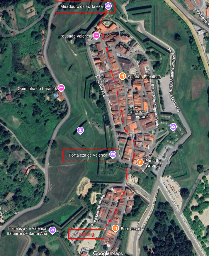 - Fortaleza de Valença ⭐⭐⭐⭐⭐- старый город, крепость и шоппинг текстиля!!! Основная цель - пройти по торговой улице до смотровой площадки Miradouro da Fortaleza. Удобный ближайший паркинг платный и находится в начале городка Parking fortaleza, но в округе много платных парковок. Место туристическое - народа и машин много) Ниже приведена карта прогулки по крепости Fortaleza de Valença. Время на посещение 40 минут, без учета шоппинга) Тут много магазинов постельного белья производство Португалия. Качество текстиля приближенно к Турции. Цены не высокие.
