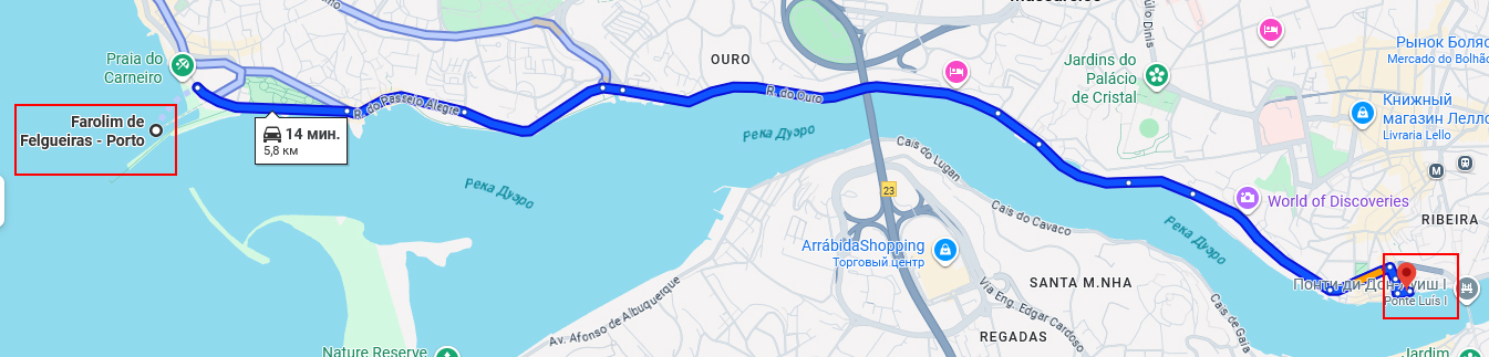 - Cais da Ribeira / Ribeira do Porto ⭐⭐⭐⭐⭐ - начало лучшей части пешего маршрута! Тут нужно пройти набережную, как указано на карте синими точками и перейти на мост. Локации, указанные отсюда и ниже, описаны ниже в разделе смотровые площадки и места встречи заката.