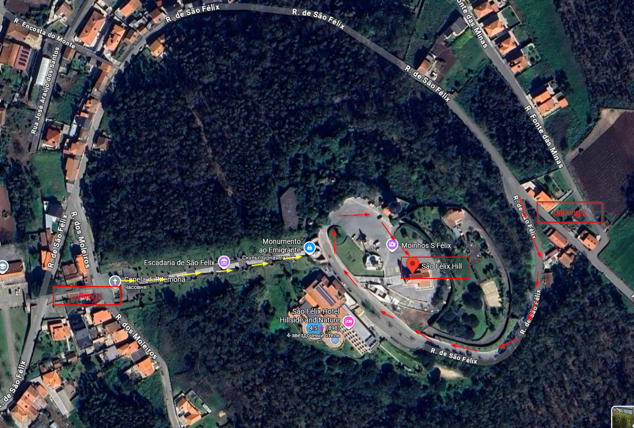 - São Félix Hill ⭐⭐⭐- это церковь с обширной панорамой. Ниже на карте приведена карта. Организованная парковка 'в поле' тут есть в районе Parking 2, но открывается она скорее всего в праздники. В другое время нужно искать парковку вдоль дороги. С любого расположения парковки нужно будет идти вверх, от Parking 1 по ступенькам, от Parking 2 по автомобильной дороге. Время посещения, с учетом паркинга, около 30 минут. Тут по сути можно сделать только красивое фото с видом на лестницу.