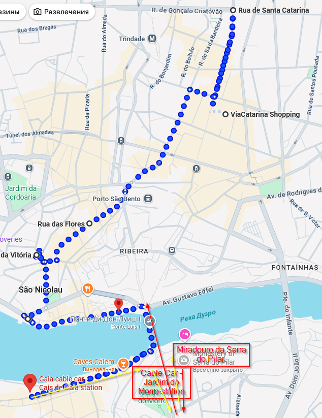 - Jardim do Morro ⭐⭐⭐⭐⭐ - сюда попадаем по желтым стрелочкам на канатной дороге Gaia Cable Car - Jardim do Morro station. Любуемся от сюда городом и следуем по желтым стрелочкам к лучшей смотровой площадке Порту - Miradouro da Serra do Pilar. Затем возвращаемся к мосту (красные стрелочки) и переходим его, уже по верхней дороге, где ездит метро. На этом пеший маршрут можно закончить)