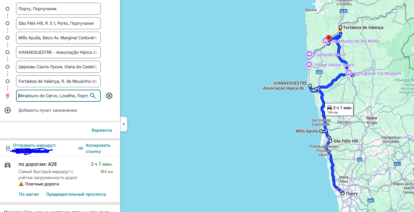 Данный маршрут предполагает проезд вдоль Атлантического океана от Порту до границы с Испанией. Локации тут как всегда, не цель, а ориентир пути. На него уйдет не менее 6-8 часов. Это нужно учитывать, если есть желание приехать на место крайней панорамной площадки именно на закате. Ниже приведены все точки на карте - это 3-4 часа в одну сторону (не по набережной, а по трассе), назад в Порту возврат от смотровой площадки Miradouro do Cervo занимает 1 -1,5 часа, поэтому после заката можно быстро и комфортно вернуться назад. Но учтите, что данный маршрут предполагает проезд вдоль самой кромки воды, поэтому время покатушек автоматически увеличивается в 2 раза. Итого, на этот маршрут уйдет весь световой день.